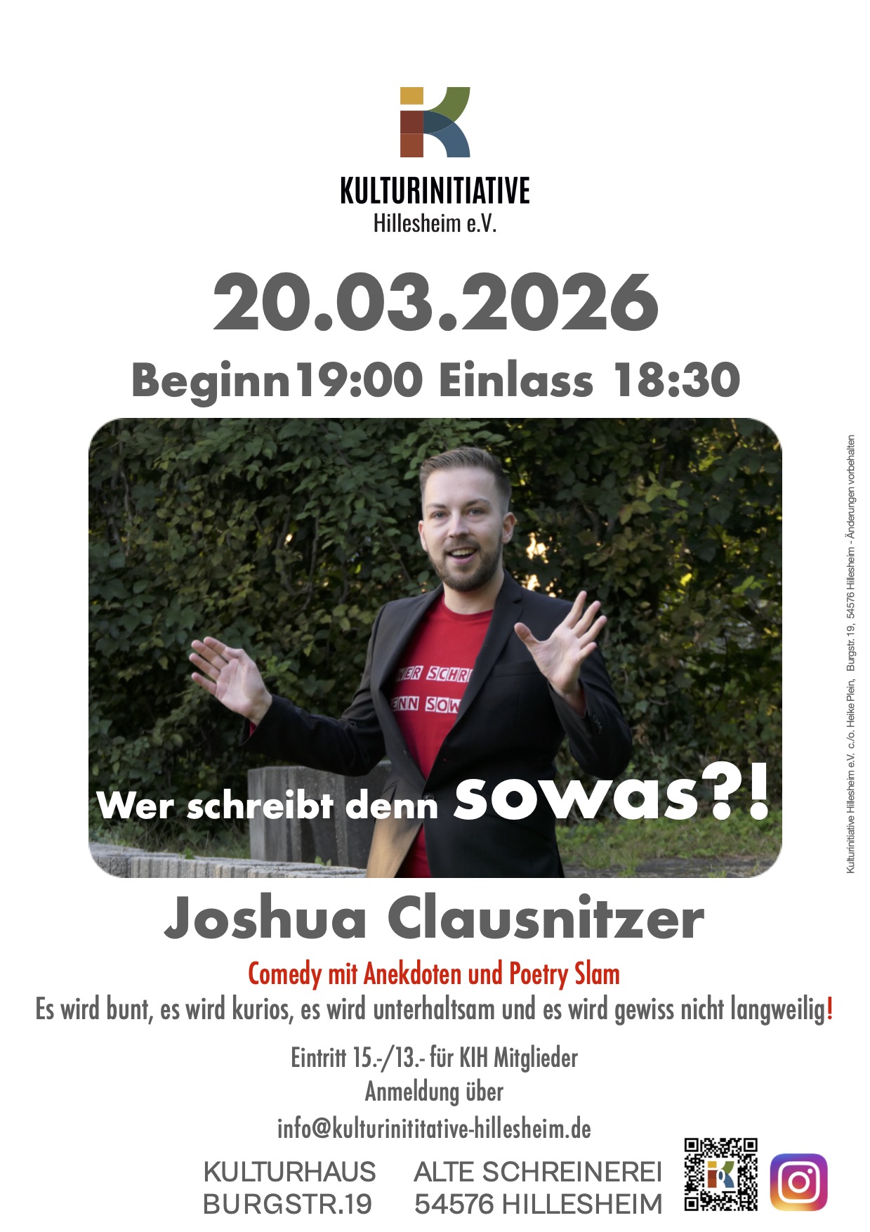 Clausnitzer wird sein gleichnamiges Buch ,,Wer schreibt denn sowas?!“ vorstellen, sowie neue Texte und aus seinem neu erschienenen Roman ,,Ich sprach E, du O!“ (Komödie) vortragen. Es wird ein launiger Abend, der in Erinnerung bleibt!