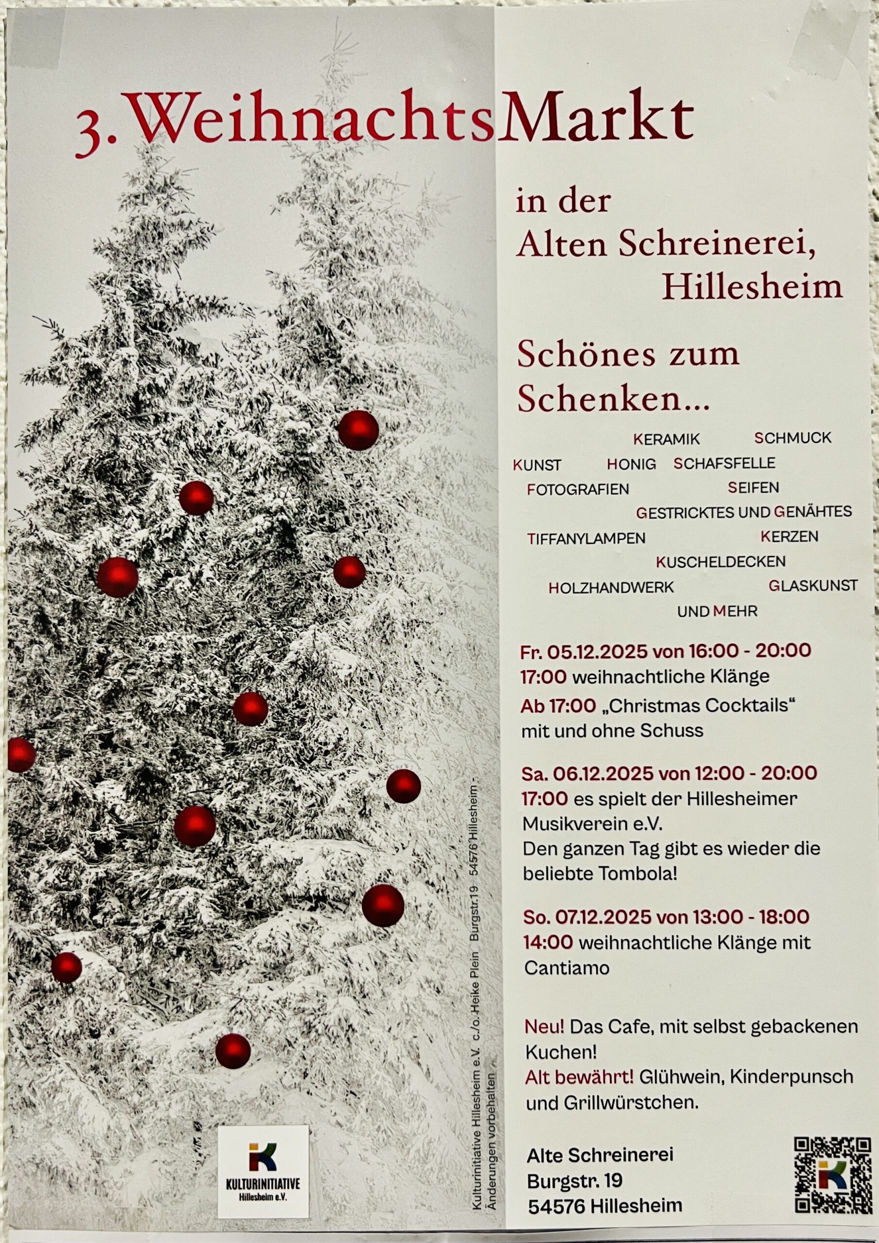 | Ein beliebtes und gut besuchtes Ereignis ist jedes Jahr der Weihnachtsmarkt in der „Alten Schreinerei“. Bei Kuchen- und Kaffeeduft, Glühwein und -saft, Weihnachtscocktails oder auch Bier und Würstchen gibt es an den Ständen zu bestaunen: |